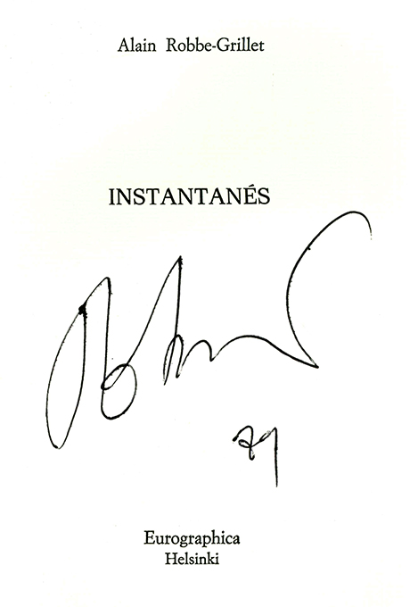 Robbe-Grillet, Alain, Instantanés. (Sprache: Französisch). (= Ecrivains Contemprains en Editions Limitées et Signées 35). Helsinki, Eurographica 1989. 82, (10) S., OKt. mit OBüttenumschlag. Tadelloses, am Kopf- u. Seitenschnitt unbeschnittenes Exemplar. 1. Auflage. * Eins von 350 nummer. Exemplaren, auf dem Titelblatt von Robbe-Grillet signiert u. datiert. Schöner Druck auf sehr kräftigem Michelangelo-Bütten der Papeterie Magnani.