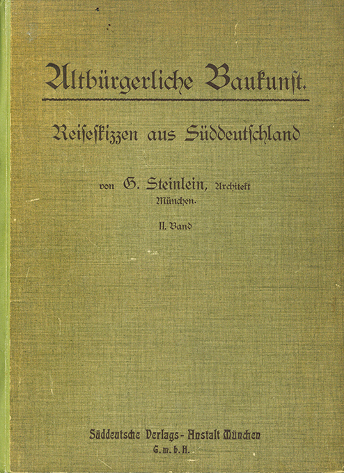 Steinlein, Gustav (Architekt in München), Altbürgerliche Baukunst. Reiseskizzen aus Süddeutschland. Alt-Bayern, Tyrol, Franken und Württemberg. Einführung von Franz Zell. Zweite Folge. (= Schriften des Bayerischen Vereins für Volkskunst und Volkskunde). München, Süddeutsche Verlagsanstalt 1907. 22,5 x 30,5 cm. (6 S.) Text mit 2 Abbildungen, 40 lose Tafeln in OHalbleinen-Flügelmappe (nachgedunkelt u. berieben). Innen sehr gut erhalten. EA.