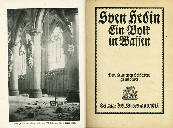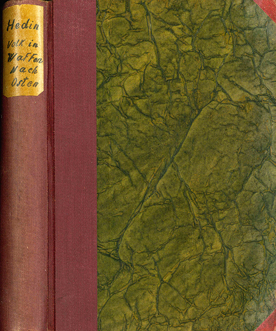 Hedin, Sven, Ein Volk in Waffen. Den deutschen Soldaten gewidmet. UND: Nach Osten! Zwei Bände in einem Band. Leipzig, Brockhaus 1915 u. 1916. 190, (2) u. 181, (3) S. + 46 Tafeln, schlichter HLwd. mit Leinenecken u. handschr. Rückenschild. Papier wie immer materialbed. etw. nachgedunkelt; insges. gutes Exemplar. EA. * Beide Werke in einem Band. Darin schildert der schwedische Forscher seine Erlebnisse und Eindrücke von einer Reise an die deutsche Westfront und an die Ostfront zu Beginn des Ersten Weltkriegs.