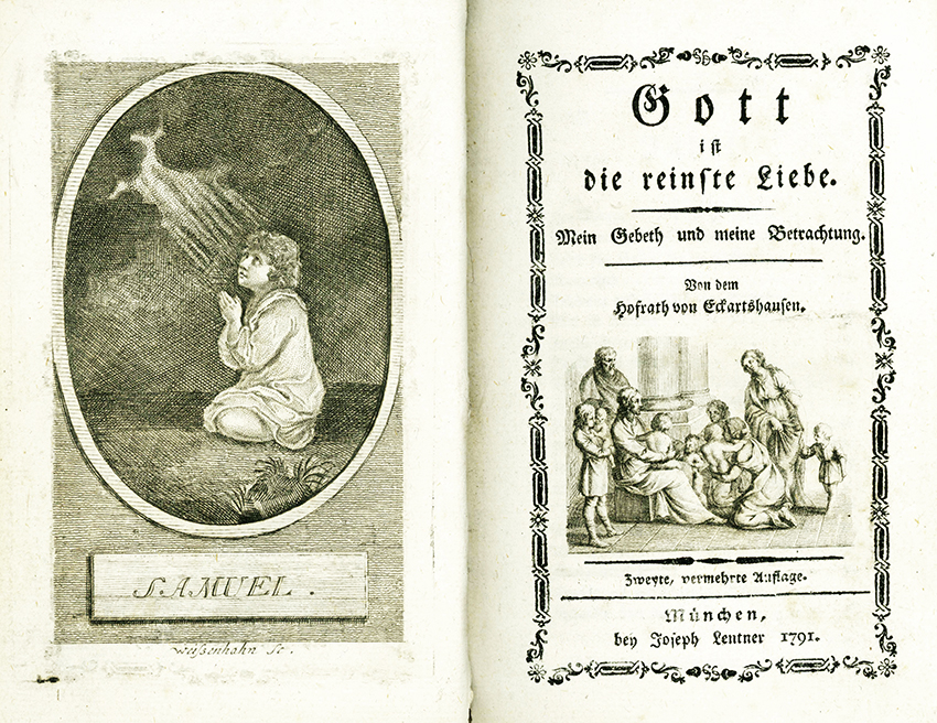 Einband – Eckartshausen, K. von, Gott ist die reinste Liebe. Mein Gebeth und meine Betrachtung. Zweyte, vermehrte Auflage. München, Lentner 1791. Kl.-8°. Doppeltitel mit gest. Frontispiz u. Titelvignette von Weißenhahn sc., 2 Bl., 270 S. mit Zierrat u. Holzschnittvignetten, Lederbd. der Zeit (nur minimal berieben u. bestoßen, 2 Läsuren im Innenfalz). Insges. hervorragend erhalten und fleckenfrei. * In einem geglätteten, burgunderroten Ganzmaroquineinband auf vier Bünden, mit reicher Goldprägung: Deckel mit floraler Spitzenbordüre u. Eckfleurons, Rücken mit floraler Vergoldung, Ganzgoldschnitt mit etwas gepunztem Dekor. Zweifarbige Buntpapiervorsätze.