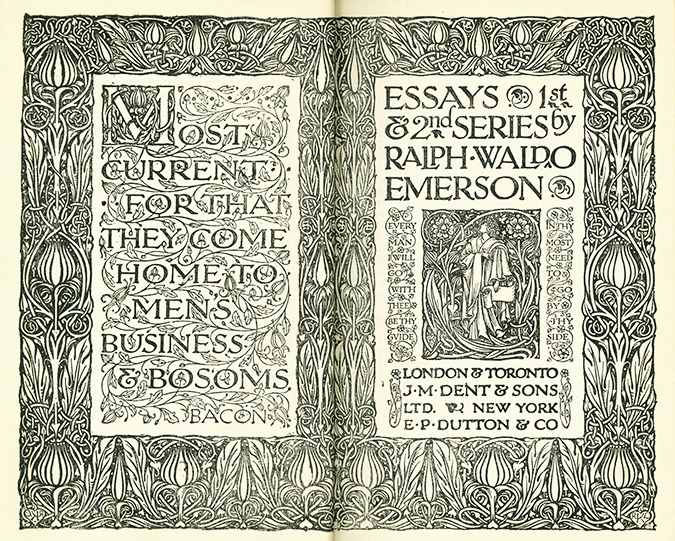 Emerson, Ralph Waldo, Essays. 1st & 2th Series. London u. Toronto, Dent u. New York, Dutton 1930. 15. Aufl. Kl.-8°. (6), 358, (4) S. mit Jugendstildoppeltitel u. -vorsätzen, weinroter OGanzlederbd. mit Goldpr. u. Kopfgoldschnitt (Rücken minim. verblasst, etw. berieben). Vorsätze etw. nachgedunkelt u. mit Besitzvermerk. Insgesamt gutes Exemplar in der schönen Ledervariante.