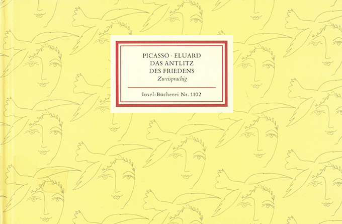 Insel-Bücherei 1102 – Picasso, Pablo – Paul Éluard, Le Visage de la paix – Das Antlitz des Friedens. Französisch-Deutsch. Hrsg. mit Nachwort von S. Goeppert u.a. (= Insel-Bücherei 1102). Frankfurt, Insel (2004; 10. Aufl.) 18,5 x 12 cm (quer). 74, (6) S. mit 30 (ganzseit., 2 farb., 27 farb. unterlegten) ganzseit. Illustr. u. 2 Abb. im Nachwort, illustr. OPp. (Überzugspapier Jenne 751). Rückdeckel mit größerer Schabstelle, sonst tadellos. Vgl. Kästner 1102.