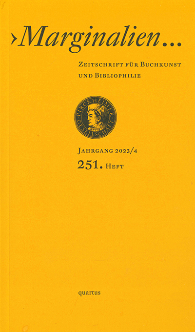 Marginalien, Heft 4 / 2023 (Nr. 251, Vorzugsausgabe). Zeitschrift für Buchkunst und Bibliophilie. Hrsg. von der Pirckheimer-Gesellschaft. Bucha, quartus 2023. Gr.-8°. 127 S. mit zahlr. Abbildungen, 8 S. typograph. Beilage (Buchdruck auf getöntem Papier), OKlappenkart. Tadellos. * Mit einem beilieg. zweifarb. Orig.-Linolschnitt zu Nancy Campbells „Black Hole V“ von Petra Reichenbach, auf kräftigen Karton gedruckt, verso betitelt, nummeriert (eins von 110 Ex.) u. signiert. – Aus dem Inhalt: Sascha Wiederhold. Über Bucheinbände für Hannah Höch, Plakate für „Der Sturm“ u.a.; Sascha Wiederhold, Das richtige Lesen des Börsenblatts; Büchersammlung Martin Raschke; K.-G. Hirsch, Für Wu (mit Holzstich-Abb.); Das Exlibris-Werk von Walther u. Gertrud Caspari. – Typograph. Beilage: Gedichte Gebilde – kurz lang eckig rund. Kompiliert u. annotiert von Jürgen Engler, gestaltet u. kommentiert von Matthias Gubig.