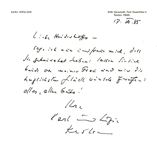Krolow, Karl, Eigenhänd. Brief mit Unterschrift. Darmstadt, 17. III. 85. 4°. 2/3 Seite Leichte Knitterspuren, sonst gut. * Gratuliert dem frisch gebackenen Verleger-Paar Heiderhoff zur Hochzeit. Heiderhoff hat mehrere Bücher Krolows verlegt.