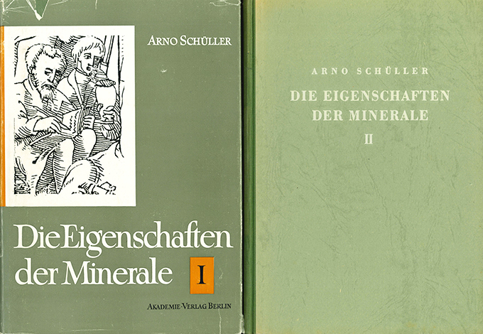 Mineralien – Schüller, Arno, Die Eigenschaften der Minerale. Ein Lehr- und Hilfsbuch zum Bestimmen von mineralischen Rohstoffen und Kristallformen. Zwei Bände. Berlin, Akademie-Verlag 1957 / 1954. Gr.-8°. (8), 199 S. mit 6 Figuren u. (8), 602 S. mit 49 Figuren, OLwd. mit (etw. läd.) illustr. OUmschl. (Bd. I) u. OHlwd. (Bd. II; dieser stellenw. verblasst, etw. gewölbt). Vorsätze von Bd. II nachgedunkelt u. mit Klebstoffspuren, einige Bleistiftanstr. u. -anmerkungen. Insges. wohlerhalten. Bd. I liegt in der 4. neubearbeiteten Auflage vor, Bd. II in EA. * Bd. I mit eigenhänd. Widmung: „Mit bestem Dank überreicht von Ihrem Arno Schüller“. – I. Die äußeren Kennzeichen insbesondere der erz- und gesteinsbildenden Minerale. Mit einem Anhang zur Bestimmung der Uran-Thorium-Minerale. II. Mineralchemische Tabellen und qualitativ-chemische Nachweisverfahren. – Dieses Werk des bedeutenden Geologen und Mineralogen gilt als klassisches Lehr- und Hilfsbuch zur Bestimmung mineralischer Rohstoffe und Kristallformen. Dabei fokussierte er sich darauf, Minerale anhand ihrer äußeren Kennzeichen und physikalischen Eigenschaften systematisch bestimmbar zu machen.