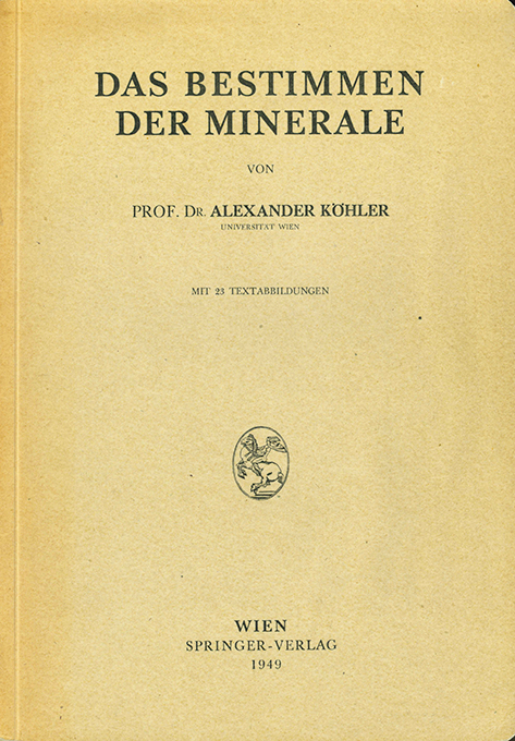 Mineralien – Köhler, Alexander, Das Bestimmen der Minerale. Wien, Springer 1949. Gr.-8°. V, 150 S., OBrosch. (etw. nachgedunkelt). Das erste u. letzte Bl. mit Klebstoffspuren wg. Einschlagfolie. Sonst gutes Exemplar. EA.