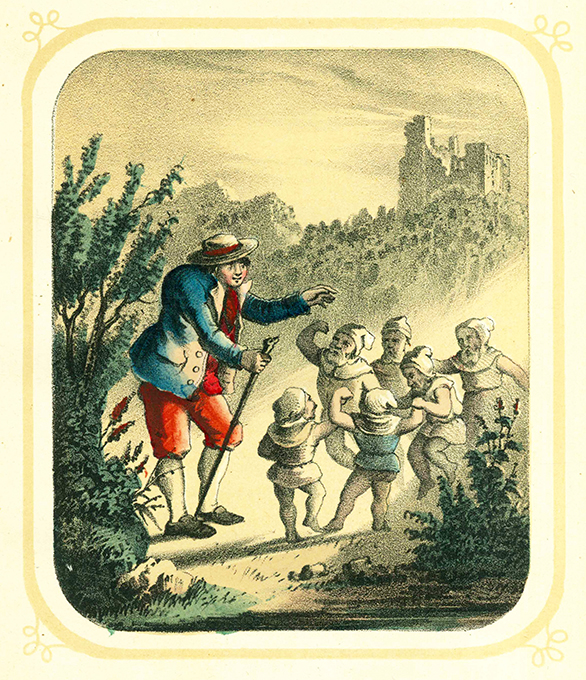 Hosemann – Kolb, C(hristian) F(riedrich) A(ugust), Schauspiele für die Jugend und ihre Freunde zu Aufführung im Figurentheater und Familienkreise. Mit 6 handkolorierten lithograph. Tafeln von Theodor Hosemann. Stuttgart, Schmidt & Spring 1854. 13,5 x 18,5 cm. IV, (2), 120, (2) S. + 6 Tafeln, OPappbd. mit Illustrationen auf Vorder- u. Rückdeckel (stellenw. etw. nachgedunkelt, der Rücken stärker, angestaubt, einige kl. Fleckchen, etw. bestoßen). Textpapier etw. stockfleckig, die Vorsätze stärker. Die Tafeln dagegen fleckenfrei u. frisch. Titelbl. mit sehr kl. nettem Besitzstempel. Insgesamt gutes Exemplar, im Originaleinband selten. Rümann 911. Wegehaupt II.1867. * Die in kraftvollen Farben kolorierten Lithographien zu folgenden, für die Jugend bearbeiteten bekannten Stücken: Die Gaben der Zwerge; Die angenommene Tochter; Fortunat und seine Söhne; Das Vogelnest; Das Wirtshaus im Spessart; Kunz von Kaufungen.