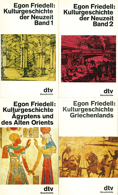 Friedell, Egon, Kulturgeschichte der Neuzeit I u. II. UND: Kulturgeschichte Ägyptens und des alten Orients. UND: Kulturgeschichte Griechenlands. Ungekürzte Ausgaben. Vier Bände. München, dtv 1986/87 (Mischauflage). Kl.-8°. Zus. 2438 S. mit 4 Kartenskizzen, farb. illustr. OKtbde. in farb. illustr. Schuber. Einbände stellenw. etw. nachgedunkelt, sonst tadellos. * Friedells monumentale, jedoch sehr lebendig geschriebenen Kulturgeschichten in ihrer kompaktesten Form.
