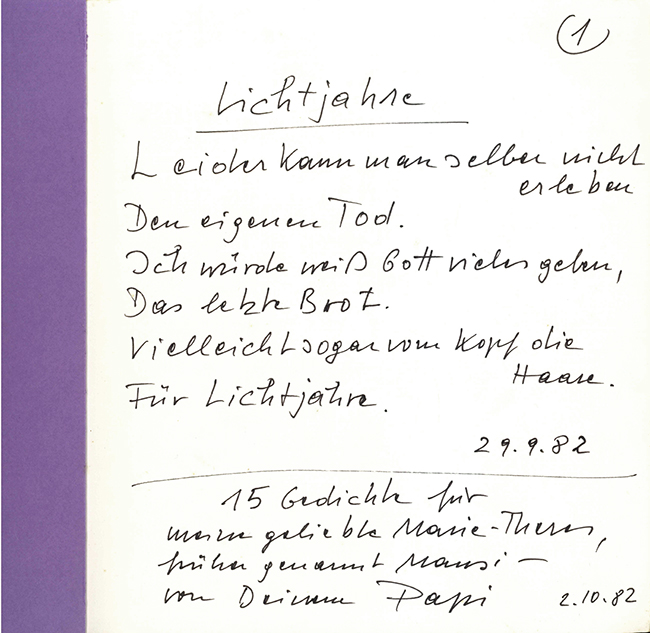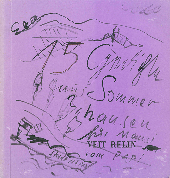 Relin, Veit, 15 Gedichte aus Sommerhausen. (Sommerhausen, Privatdruck des Dichters) 1982. 20 x 21 cm. 1 handgeschr. Bl., 13 einseit. bedruckte Bl., 1 Bl. mit mont. Gedicht, OKt. (etw. verblasst, Vorderdeckel mit wenigen hellen Fleckchen). EA. * In nur wenigen Exemplaren für Freunde hergestellt (womöglich ist es sogar das einzige), zumindest dieses Exemplar ein Unikat: Vorderdeckel mit Orig.-Tuschezeichnung von Veit Relin sowie mit eigenhänd. Widmung „für Mausi vom Papi“, daneben ein kleines Mäuschen gezeichnet. Das erste Gedicht wurde nicht gedruckt, sondern von Veit Relin von Hand geschrieben, darunter eine weitere Widmung „15 Gedichte für meine geliebte Marie-Theres, früher genannt Mausi – von Deinem Papi. 2. 10. 82“. Das letzte Gedicht wurde ebenfalls nicht gedruckt, sondern als Orig.-Typoskript mit dem eigenhänd. Vermerk „Das 15. Gedicht“ einmontiert. – Marie-Theres Relin ging aus der Ehe zwischen Veit Relin u. seiner weltberühmten Frau, der Schauspielerin Maria Schell hervor. Veit Relin (1926 – 2013) war österreich. Schauspieler, Drehbuchautor u. Regisseur, später wandte er sich auch der Malerei u. Dichtkunst zu.
