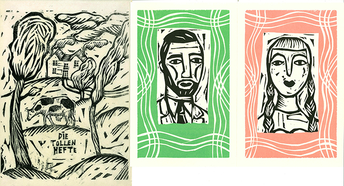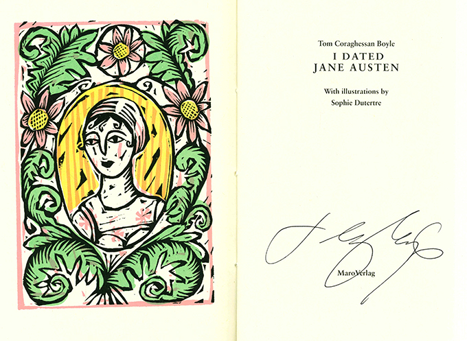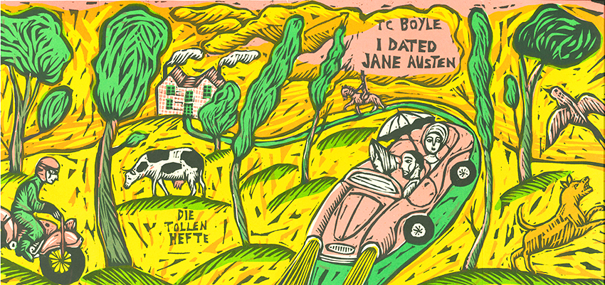 Tollen Hefte, Die – Boyle, T.C., I Dated Jane Austen. Mit 8 (6 ganzseit., 2 doppelblattgr.) farbigen Orig.-Flachdruckgraphiken u. 1 Vignette nach Holzschnitten von Sophie Dutertre. (= Die tollen Hefte 14). Augsburg, Maro 1997. 23, (5) S., OBrosch. mit farb. illustr. OUmschl. (großformatige Orig.-Flachdruckgraphik über beide Deckel u. Innenklappen). Tadellos. EA. * Eins von 50 (ges. 500) nummer. Exemplaren der englischen Vorzugsausgabe, welche von Boyle u. Dutertre signiert wurde. Mit einer Beilage: Gefalt. Bogen mit 2 ganzseit. Orig.-Holzschnitten (farbig umrahmte Portraits von Boyle u. Austen) u. Kurzbiographien von Boyle u. Dutertre. Im Orig.-Pergamentpapierkuvert mit einem einfarb. Orig.-Holzschnitt der Künstlerin.