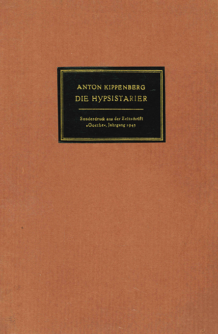 Hypsistarier – Kippenberg, Anton, Die Hypsistarier. Sonderdruck aus der Zeitschrift „Goethe“, Jahrgang 1943. Gr.-8°. 18, (2) S., 1 gefalt. Goethe-Faksimile, OBüttenbrosch. mit goldgepr. Deckelschild (1 Ecke etw. angeknickt). Gutes Exemplar. Selten. * Die pagan-jüdische Religionsgruppe (3.-4. Jh. n. Chr.) ist durch Goethe ins öffentliche Bewusstsein der Neuzeit gerückt worden, der sich im Zuge der Abfassung des West-östlichen Divans sehr mit Sekten und religiösen Gestalten beschäftigt hatte.