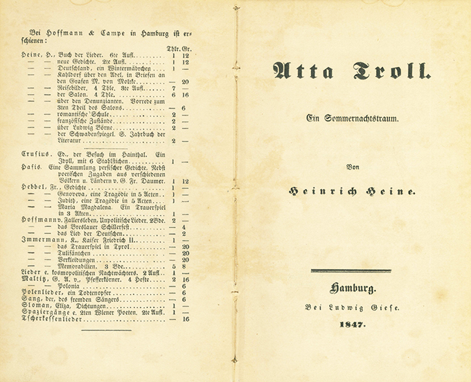 Heine, Heinrich, Atta Troll. Ein Sommernachtstraum. Mit einer Vorrede Heines, dat. Paris, Dezember 1846. Hamburg, Ludwig Giese (d.i. Hoffmann und Campe) 1847. Kl.-8°. XIV, 158 S., 6 S. Verlagsanzeigen, Halbleinenbd. der Zeit (ew. berieben u. bestoßen). Papier wie üblich etw. nachgedunkelt u. leicht stockfl. Insges. gutes Exemplar. Exemplare mit der „gefälschten“ Verlagsangabe (siehe Kommentar) deutlich seltener. EA WG² 18. Goedeke VIII, 561, 81. Wilhelm-Galley 325. Houben I.423f. * Der Verleger Julius Campe „versah den Teil der Auflage, der für Preußen und andere gefährliche Vertriebsgegenden bestimmt war, mit einer anderen Verlagsfirma, der er sich damals auch bei einer politischen Schrift des Freiherrn v. Andrian Werburg bediente: Hamburg, Ludwig Giese. In dieser doppelten Gestalt versandte er Frühjahr 1947 (…) das zweite Epos Heines.“ (Houben) – „Zeitbeziehungen in Fülle, kecker Humor, obgleich in morgenblättlicher Mäßigung…“ (Heines Selbstdarstellung seines Werkes gegenüber seinem Freund Heinrich Laube)