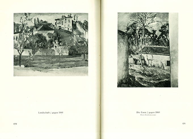 Cézanne – Meier-Graefe, Julius, Cézanne und sein Kreis. Ein Beitrag zur Entwicklungsgeschichte. München, Piper 1922. 6.-8. Tsd. 4°. 250 S. mit Abbildungen im Text, 1 Titelportrait in Lichtdruck u. 171 ganzseit. SW-Abbildungen in Tonätzung auf Tafeln, OHLdr. (Rücken verblasst, Kopfkapital mit 8 x 15 mm großer Fehlstelle). Nachsatz u. das anliegende Leerbl. mit Stockflecken, Schnitt mit einem Stockfleck. Insges. gutes Exemplar. * Sehr seltene Ausgabe in Halbleder (in aller Regel Halbleinen oder Leinen), mit reicher Rückenvergoldung, Kopfgoldschnitt u. handgefertigtem Kleister-Überzugspapier.
