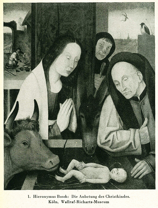 Bosch, Hieronymus, Die Anbetung des Christkindes. Einführung von Karl vom Rath. (= Der Kunstbrief 44). Berlin, Gebr. Mann 1948. Kl.-8°. 32 S. mit 7 Abbildungen + 16 Tafeln, OBrosch. (Rücken verblasst). Gutes Exemplar. EA.
