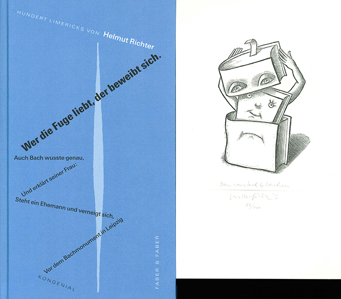 Herfurth – Richter, Helmut, …wer die Fuge liebt, der beweibt sich. Hundert Limericks mit hundert Illustrationen von Egbert Herfurth. Leipzig, Faber & Faber 2013. 113, (7) S., OPp. Tadelloses Exemplar, noch im Orig.-Verlagspapier (dieses mit Motiven dieses Buches bedruckt). EA. * Eins von 100 (ges. 1000) der Vorzugsausgabe mit einer beilieg. Orig.-Graphik (wohl ein Acrylstich) „Das versteckte Lachen“, von Herfurth eigenhänd. betitelt, nummeriert, signiert u. datiert.