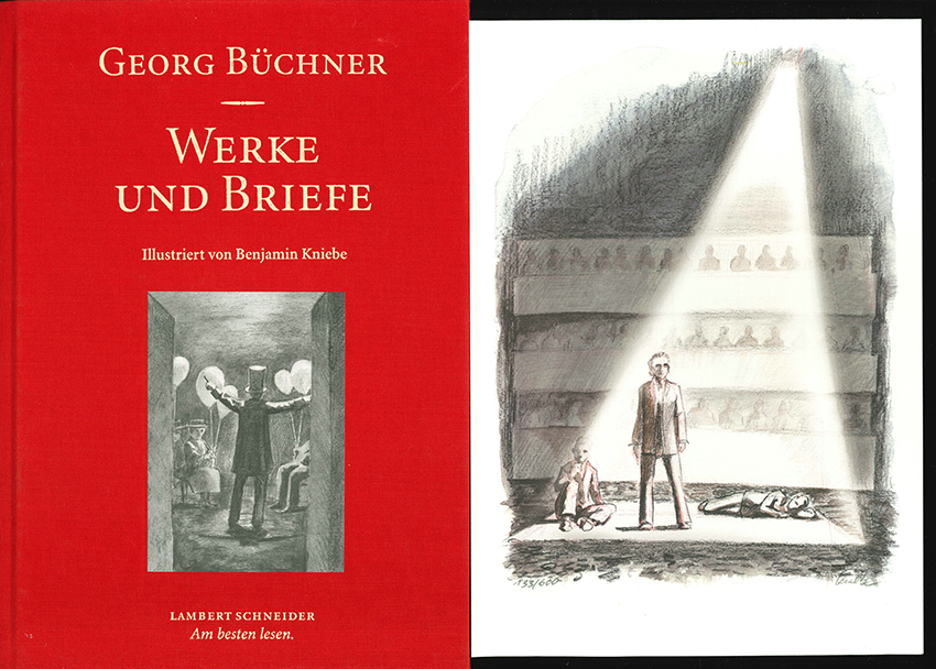 Büchner, Georg, Werke und Briefe. Hrsg. von Arnd Beise, Tilman Fischer u. Gerald Funk. Illustriert von Benjamin Kniebe. Darmstadt, Lambert Schneider 2013. 4°. 240 S. mit 12 ganzseit. Illustrationen, OLwd. mit mont. Deckelillustration. Sehr gutes Exemplar. 1. Auflage. * Obgleich hier eine Normalausgabe vorliegt, enthält unser Exemplar lose beiliegend eine farbige Orig.-Offsetlithographie auf Bütten, welche ansich nur den Vorzugsausgaben vorbehalten war. Nummeriert (eins von 600 Ex.) u. signiert. – Vortitelblatt mit zehnzeil. eigenhänd. Widmung des Künstlers an den Leipziger Antiquar Dieter Bührnheim: „…ich hätte nicht gedacht, in Ihre illustre Sammlung aufgenommen zu werden (…) Aus der Schönheit keimt das Gute, in der Begegnung trägt es Früchte.“