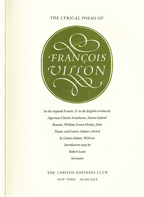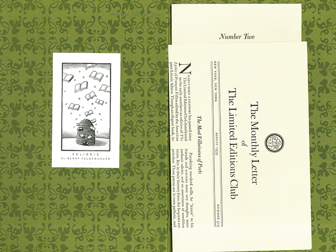 Villon, François, The Lyrical Poems. In the original French, & in the English versions by Algernon Charles Swinburne, Dante Gabriel Rossetti, John Payne u.a.; selected by Léonie Adams. With an introductory essay by Robert Louis Stevenson. New York, The Limited Editions Club 1979. 4°. 145, (3) S., OLwd. mit Goldpr. Tadelloses Exemplar in (an den Rändern minim. verblasstem) Schuber. Innendeckel mit einem Exlibris von Egbert Herfurth (Bücher fliegen aus einem Bienenstock), von Herfurth signiert. * Nr. 19 von 2000 handschr. nummer. Exemplaren. Signiert von Stephen Harvard, welcher Typographie, die kalligraph. Titelvignette u. den Einband entworfen hatte. Gedruckt auf Curtis Rag-Papier der Meriden Gravure Company. – Beiliegt ein Verlagszettel zu diesem Buch sowie „The Monthly Letter“ der Edition Nr. 513.
