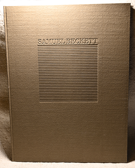 | Raamin-Presse – Beckett, Samuel, Der Ausgestoßene. Übertr. von Elmar Tophoven. Mit 11 Orig.-Holzstichen von Roswitha Quadflieg. Hamburg 1976. 22,5 x 29,5 cm. 35, (3) S., blindgepräger OPappbd. (Christian Zwang). Makelloses Exemplar in einem älteren, nicht zum Buch gehörenden, marmorierten Schuber, welcher vom Format tadellos passt und das Buch über all die Jahre bestens geschützt hat. Tiessen 9. Spindler 71.7. Almanach 20 Jahre Raamin-Presse S. 58 – 65. * 7. Druck der Raamin-Presse. Eins von 170 nummer. Exemplaren, von der Künstlerin signiert. – Handsatz aus der Madison-Antiqua, gedruckt auf Bütten-Werkdruck. Die Textblöcke sowie die Holzstiche sind fast quadratisch angelegt, der breite weiße Rand läßt viel Raum zum Atmen. Druck der Texte in Schwarz, der Holzstiche in Dunkelbraun. Die Stiche zeugen von Einsamkeit: ein Treppenaufgang, ein Hut und immer wieder die Kutsche. Ein früher Druck der großen Buchkünstlerin, in dem sich die Sichnowsky-Schülerin ohne graphische Experimente und unverkünstelt auf die Ursprünge ihres Könnens konzentriert hat.