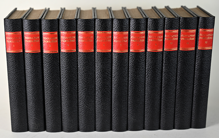 Education familière, ou séries de lectures pour les enfants, depuis le premier age jusqu’à l’adolescence, tirées de divers ouvrages de Miss Edgeworth. Traduit de l’anglais, avec des changements et des additions considérables par Louise SW-Belloc. Première série – sixtième série (vollständig). 12 Bände. Paris, Renouard (um 1837 – 1840). 9 x 14,5 cm. Zus. 3674 S. mit 11 Titelkupfern (ein Bändchen ohne Titelblatt / Kupfer) deutlich spätere (ca. aus den 1960er Jahren) schwarze Ganzlederbde. mit roten, goldgepr. Lederrückenschildchen. Die letzten 30 Bl. in Bd. 10 mit kleinem Wasserrand an den Oberkanten, Papier vereinzelt schwach stockfl. Insges. von hervorragendem Erhaltungszustand. In dieser Vollständigkeit sehr selten. * Jede der sechs Serien umfasst zwei Bände. Die Texte richten sich – innerhalb der Serie aufsteigend – zunächst an sehr junge Leser (″Lectures du premier age“), in der Folge an Kinder / Jugendliche von 6 – 7, 7 – 8, 8 – 9, 9 – 10, 10 – 11, 12 – 13 u. 12 – 14 Jahren. Entsprechend den Altersstufen sind auch die entzückenden Kupfertafeln gestaltet.