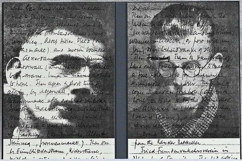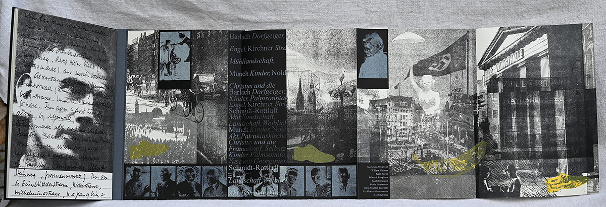 Raamin-Presse – Beckett, Samuel, Alles kommt auf so viel an. Das Hamburg Kapitel aus den „German Diaries“ 2. Oktober – 4. Dezember 1936. In der Originalfassung. Transkribiert und mit einem Nachwort von Erika Tophoven. Vorweg das Gedicht „Cascando“ in des Autors eigener deutscher Übersetzung und in Englisch. Bilder und Konzeption von Roswitha Quadflieg. Hamburg 2003. 24 x 34,7 cm. 65, (5) S., 2 Leporellos à 4 Bl., flexibler OPappbd. mit Blindprägungen in einer Halbleinenmappe u. Schuber. Tadellos. Erstausgabe. Nicht mehr im Almanach 20 Jahre Raamin-Presse. * 3. Druck / Neue Reihe der Raamin-Presse. Eins von 5 (ges. 155) römisch nummerierten Mitarbeiterexemplaren, welche nicht signiert wurden. – Die Texte wurden aus der „Gill“ mit Auszeichnungen aus der „Modern“ gesetzt u. zweifarbig in Blau u. Schwarz auf englisches Somerset-Bütten gedruckt. Das Buch selbst ist nicht illustriert, Quadfliegs Illustrationen finden sich auf zwei Leporellos, welche auf die Innenklappen der Mappe montiert sind: Insgesamt jeweils ca. 35 x 96 cm große, collagenartige, mit farbigen Elementen versehene Miraclon-Stiche mit historischen Stadtansichten Hamburgs, Portraits, Texten u. weiteren, das Jahr 1936 assoziativ betreffenden und den immer stärker aufkeimenden Nationalsozialismus aufgreifenden Bilddetails. Auf den Rückseiten der Leporellos jeweils Dichterportraits mit faks. Texten aus Becketts Handschrift, außerdem Textauszüge aus Becketts Tagebuch 24/11/36 u. aus Max Sauerlandts „Die Kunst der letzten 30 Jahre“. – Mit diesem Pressendruck schließt Roswitha Quadflieg ihre drei Jahrzehnte lang währende Karriere als Künstlerin und Herausgeberin ihrer Raamin-Presse und wendet sich seitdem vermehrt ihrer Schriftstellerei zu. Ihr waren stets nicht nur die künstlerische Gestaltung, sondern auch das Entdecken bislang unbekannter Texte und deren möglichst gründliche Herausgabe nebst Begleittexten wichtig. Vermutlich gibt es keine deutsche Presse, welche ein vielfältigeres Spektrum an Inhalten und (immer wieder, so auch in diesem Werk, durchaus experimentellen) künstlerischen sowie buchkünstlerischen Ambitionen aufweist.