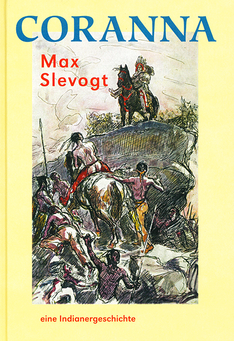 Slevogt – Claire, W. (Pseud.?), Coranna. Eine Indianergeschichte. Mit 34 (davon 5 ganzseit.) Zeichnungen von Max Slevogt. Berlin, Walde + Graf für Frölich & Kaufmann 2016. 4°. 71 S., farb. illustr. OPp. Tadelloses Exemplar dieser Neuausgabe. * Eins von 200 Exemplaren der Vorzugsausgabe mit einem beiliegenden nummer. Handsiebdruck in acht Farben auf Büttenkarton. Es handelt sich um die Illustration auf Seite 50 des Buches in deutlich größerem Format. – Alle Vermutungen deuten darauf hin, dass Max Slevogt nicht nur die Zeichnungen schuf, sondern auch den Text geschrieben hat. Tilla Durieux schreibt in ihren Lebenserinnerungen, dass Slevogt zu der Zeit seine Illustrationen zu „Lederstrumpf“ schrieb und er, sie und Paul Cassirer (obwohl schon um die 40 Jahre alt) wie Teenager Indianerspiele vollführten. „Möglicherweise ist ‚Coronna‘ aus dieser Indianerbegeisterung Cassirers, Slevogts und Durieux’ heraus unter dem Pseudonym W. Claire entstanden.“ (Brandis/Feilchenfeldt S. 106). – „Ich muss die wilden, Wild-Westmenschen festhalten, sie laufen, galoppieren, meinen Blick entlang, über meine Hände hinweg in die Freiheit. Tänze, Kämpfe, Ritte führen sie auf, ich vernehme Pferdegetrampel, höre Kriegsrufe, werde eingehüllt vom aufwirbelnden Nebel flüchtender, feindlicher Stämme. Mich ergreift die Sehnsucht meiner Brüder.“ (Rezension der Orignalausgabe von Else Lasker-Schüler in: Das Magazin, Jg. 77, Heft 4/1908).
