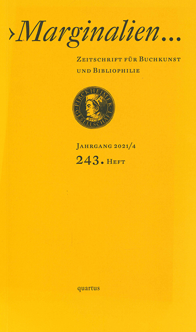 Marginalien, Heft 4 / 2021 (Nr. 243, Vorzugsausgabe). Zeitschrift für Buchkunst und Bibliophilie. Hrsg. von der Pirckheimer-Gesellschaft. Bucha, quartus 2021. Gr.-8°. 127 S. mit zahlr. Abbildungen, 8 S. typograph. Beilage (Buchdruck auf Maschinenbütten), OKlappenkart. Tadellos. * Mit einer farbigen Orig.-Risografie „Here“ von ATAK, nummeriert u. signiert (Blattgr. 19 x 25 cm, gefalzt, 630 Ex.) – Aus dem Inhalt: Vor 100 Jahren scheiterte die Zeitschrift ‚Genius‘ grandios; Die Bilderwelt des ATAK; Das Chamisso-Museum im Kunersdorfer Musenhof; Jutta Mirtschin. – Typograph. Beilage: Michael Siefener, Die Magie des Enchiridion Leonis Papae. Gestaltet u. kommentiert von Matthias Gubig.